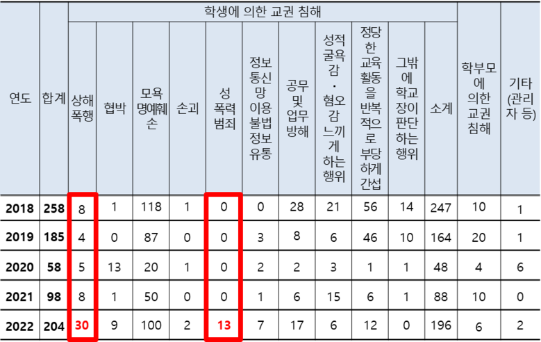 <최근 5년간 교권 침해 유형별 건수>(출처 : 경남도교육청)