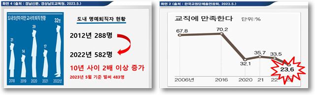 신 의원은 이런 분위기로 말미암은 교사 사기저하의 증거로, 도내 교원 중 2012년 288명이었던 명예퇴직자가 2022년 582명으로 2배 이상 증가했고, 올해 5월 기준 벌써 483명에 이른다고 밝혔다. 전국 대상 교직 만족도도 조사 이래 최저치를 기록했다.