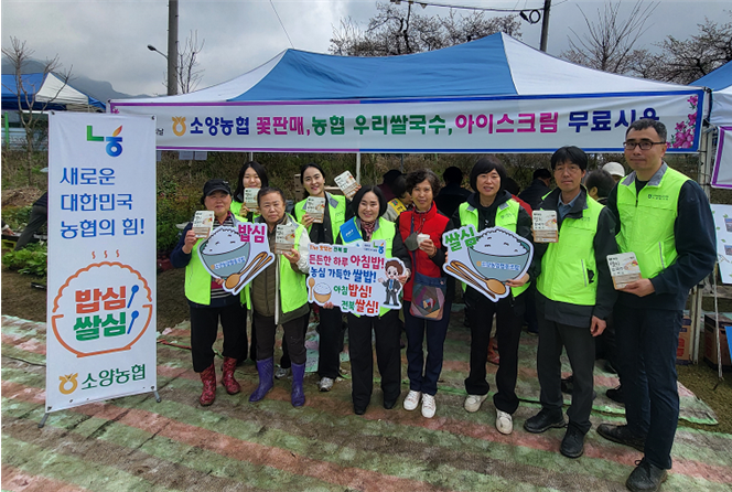 이날 행사에 소양농협 임직원 및 농가주부,고향주부 회원들의 봉사로 800여개의 우리쌀로 만든 쌀국수 무료 시식 및 나눔과 로컬푸드 꽃판매 및 따뜻한 차를 무료 시음하여 비 온뒤 추워진 날씨에 몸을 녹일 수 있었다.