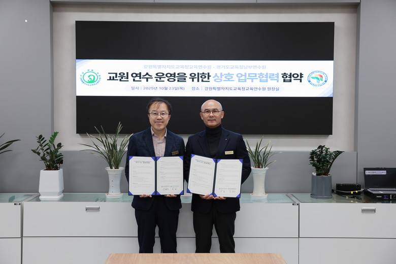 강원특별자치도교육청교육연수원에서 진행된 이번 업무협약에는 심한수 경기도교육청남부연수원장과 민섭 강원특별자치도교육청교육연수원장이 참석해 인적·물적 자원을 공유하여 연수 기획력과 실행력을 높이는 데 공동의 노력을 기울일 것을 약속했다.