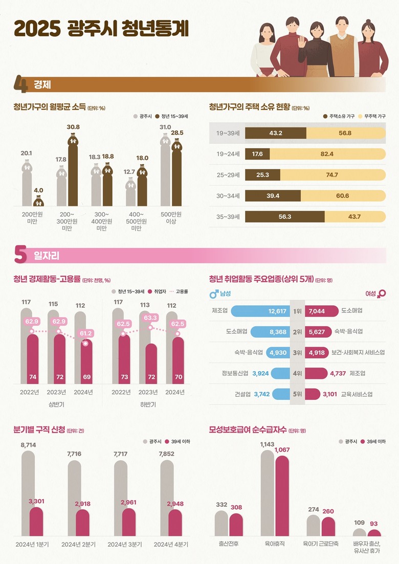 광주시 청년 통계는 2024년 11월 1일 기준 광주시에 거주하는 청년을 대상으로 행정자료와 각종 통계 데이터를 연계·분석한 행정 통계다. 인구, 가구, 인구 이동, 경제, 일자리, 창업, 복지·건강, 의식 등 9개 분야 79개 항목을 담았다.