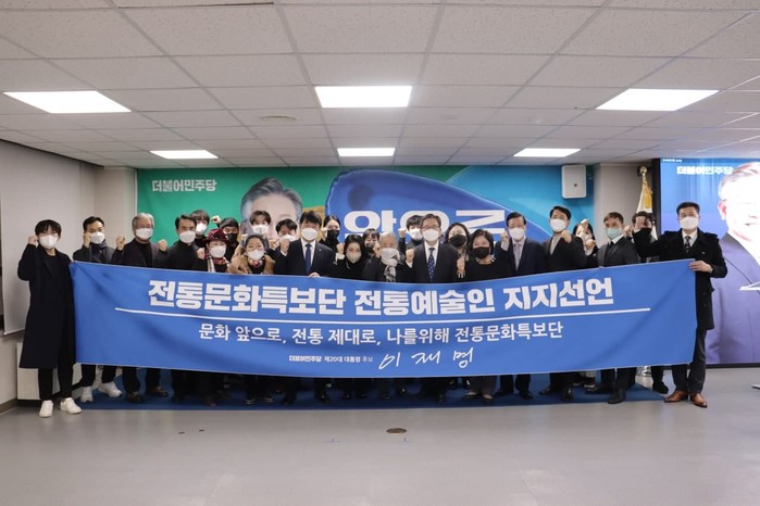 지지선언문에서 “문화예술에 대한 관심이 커지고 있으나, 전통예술에 대한 정책적 지원은 매우 미흡하다. 생명력 있는 문화로서 전통을 계승하기 위한 제도적 지원이 필요하다”며, “우리 전통예술인들의 위상을 이해하고 문화예술 전반에 거쳐 새로운 희망을 가져다줄 후보로 이재명 후보를 지지한다”고 밝혔다.