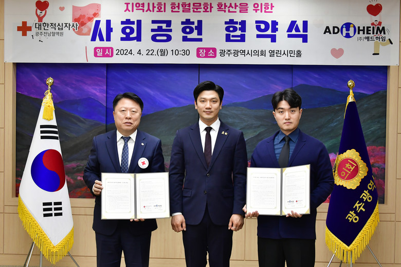 광주광역시의회 이명노(더불어민주당 서구3) 의원, 대한적십자사 광주·전남혈액원 김동수 원장, ㈜애드하임 전유태 대표가 참여한 이번 협약식은 헌혈문화 확산 위한 사회공헌 협약 체결을 위해 마련했다.