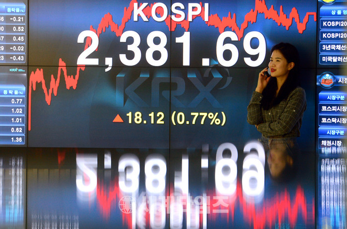 코스피지수가 18.12포인트(0.77%) 오른 2,381.69로 마감하며 사상 최고치를 기록한 9일 오후 서울 여의도 한국거래소 홍보관에서 관계자들이 코스피지수를 살펴보고 있다. 2017.06.09.