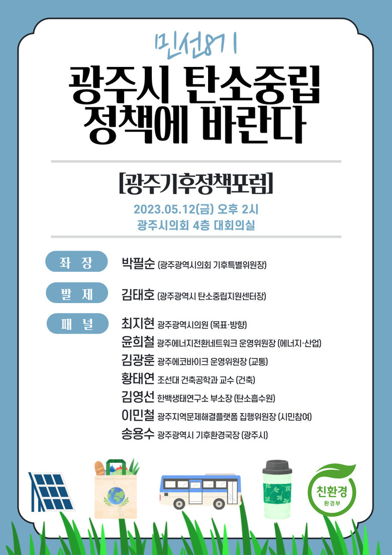 광주광역시의회 기후특별위원회는 12일 오후 2시 시의회 4층 대회의실에서 ‘민선8기 광주시 탄소중립 정책에 바란다’를 주제로 제4회 광주기후정책포럼을 개최한다.