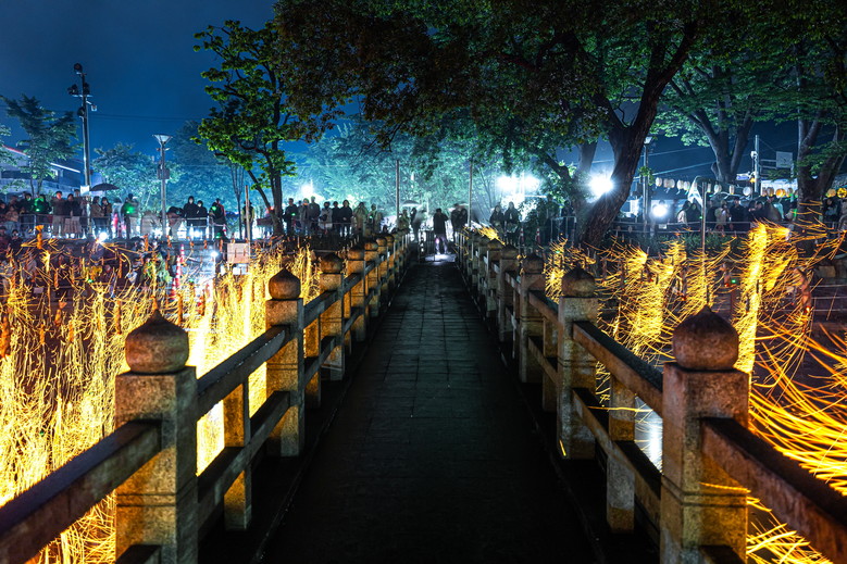 “와…” “아름답다…” 낙화봉에서 불꽃이 떨어지기 시작하자 곳곳에서 일제히 탄성이 새어나왔다. 불꽃이 흩날릴 때마다 보는 이들의 마음속에도 하나씩 환한 불이 켜지는 아름다운 순간이다.