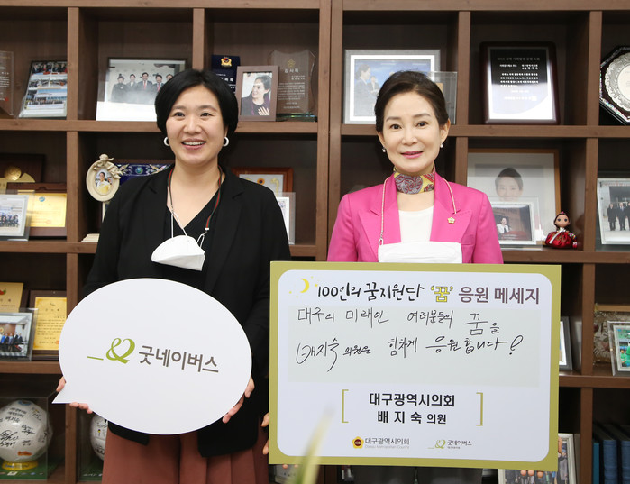 배지숙 의원은 “대구의 미래인 아동들의 꿈을 힘차게 응원한다”라고 적은 응원 메시지를 전하면서, “의정활동을 통해 우리 아이들이 꿈을 이룰 수 있도록 최선을 다해서 돕겠다”라며, “꿈 지원단뿐만 아니라 굿네이버스 등 많은 후원단체들과 함께 지역사회의 좋은 변화를 만들기 위해 노력하겠다”라고 밝혔다.