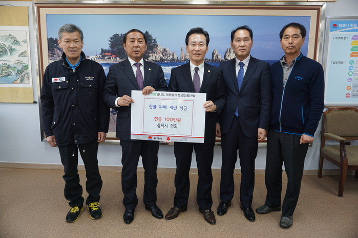 [동해시=세계타임즈 김민석 기자] 삼척시의회(의장 이정훈)와 동해중부의원협의회(회장 이정훈)는 2019년 4월 12일 동해시를 방문하여 산불피해 지원성금을 각 100만원씩 전달하였다.