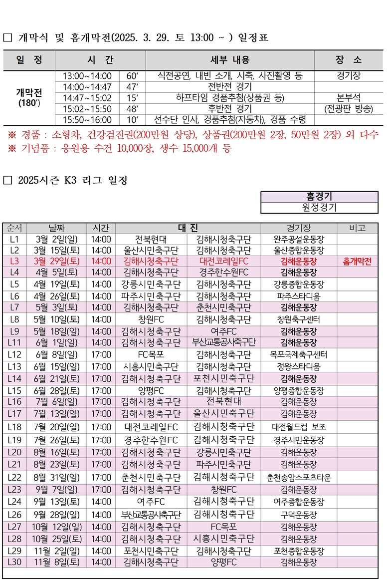 이날은 3월 29일 홈개막전(vs 대전코레일FC)을 앞둔 선수단 부담을 최소화하기 위해 감독, 코치, 주장과 주전선수 2명만 참석해 간소하게 진행됐다. 김해종합운동장에서 열리는 김해FC 창단 첫 홈경기는 소형차(캐스퍼) 등 많은 경품이 준비돼 있으며 관람자 모두에게 소정의 경품이 주어진다.