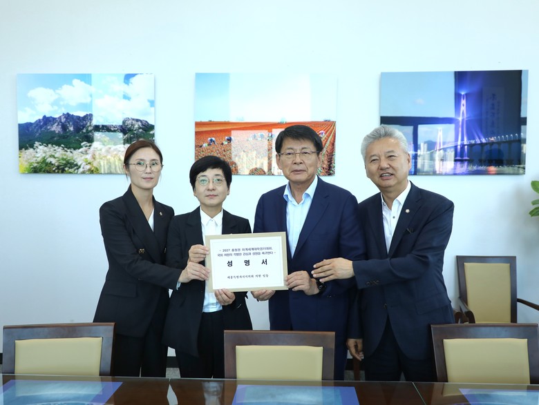 [세종 세계타임즈=이채봉 기자] 세종특별자치시의회(의장 이순열)는 2027 충청권 하계세계대학경기대회 개최를 위한 정부 예산이 감액되지 않고 유지·증액될 수 있도록 촉구하는 성명서를 6일 국회에 직접 전달했다.