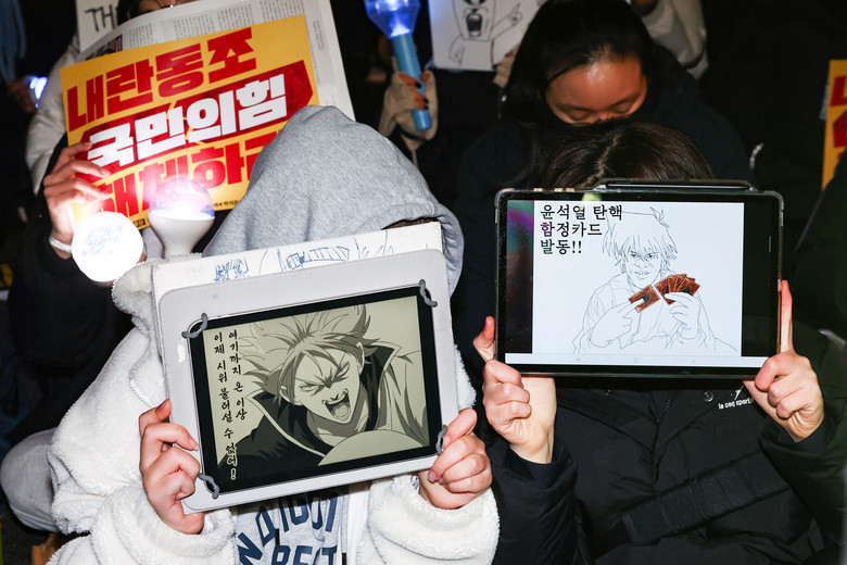 [세계타임즈 = 이장성 기자] 10일 오후 서울 영등포구 국회 앞에서 열린 윤석열 대통령 탄핵 촉구 촛불집회에서 시민들이 태블릿 PC에 탄핵촉구 메시지를 띄우고 있다. 2024.12.10