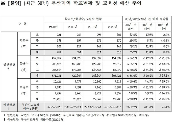그러나 학생수가 1/3로 감소한 동안 학교수는 지속적으로 증가하여 30년 전 454개교였던 학교수는 현재 616개교로 162개교가 늘었으며, 부산시교육청예산은 2,605억 원에서 4조 6,060억 원으로 약 18배 증가하여 예산절감 차원의 검토도 필요한 상황이다.