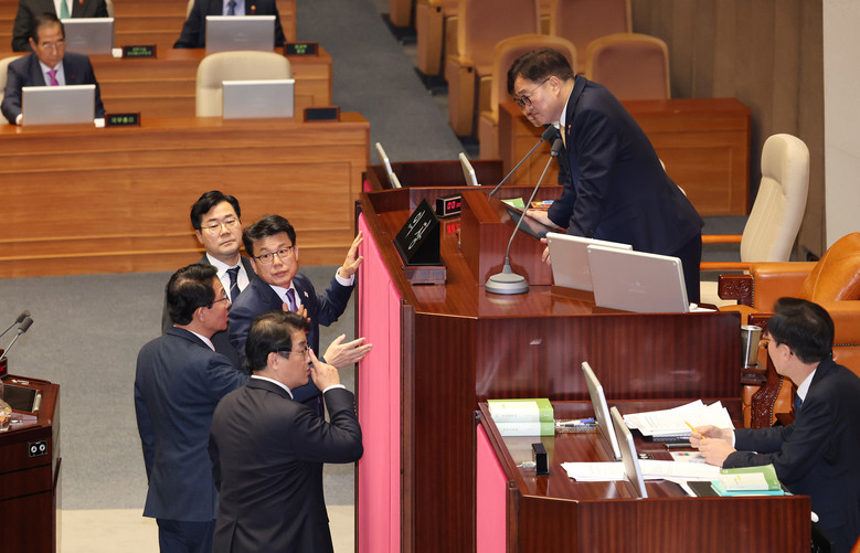 [세계타임즈 = 심귀영 기자] 우원식 국회의장이 10일 오후 국회 본회의에서 지방교육재정교부금법 일부개정법률안(대안) 상정을 앞두고 국민의힘 김상훈 정책위의장, 배준영 원내수석부대표, 더불어민주당 박찬대 원내대표, 진성준 정책위의장을 불러 논의하고 있다. 2024.12.10