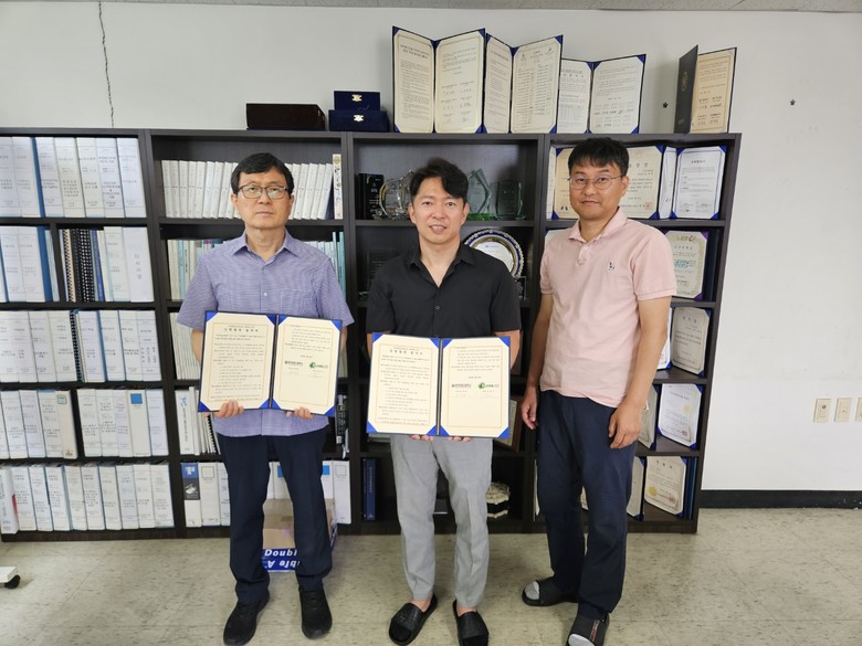 | ▲ 좌측부터 김경희 청주공고 교장, 김한주 (주)퓨리켐 대표이사, 이병관 (주)퓨리켐 재무이사 |