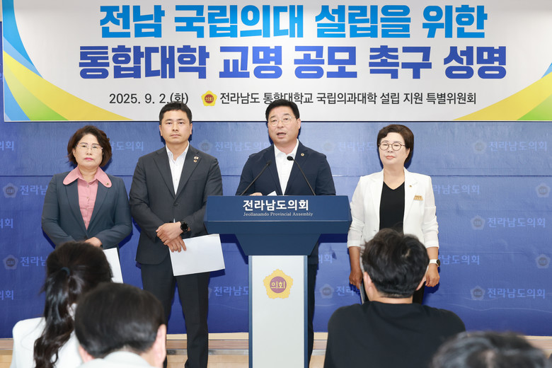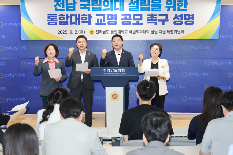 끝으로 의대 특위는 “전남 국립의과대학 설립은 지역 현안을 넘어선 국가적 책무이며, 의료 접근성의 격차를 해소하고 국민 모두가 양질의 의료서비스를 보장받기 위한 국가적 과제”라며, “전남도와 양 대학은 하나 된 마음으로 즉각 교명 공모를 추진해야 한다”고 거듭 강조했다.