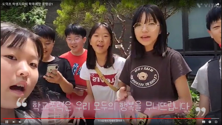 학생자치회 임원들을 중심으로 6학년 학생들이 모여 학교폭력 예방을 주제로 영상을 직접 만들고 전교생에게 상영한 것이다. 학생들이 직접 연출한 10분 길이의 영상을 통해 학생들은 학교폭력 예방에 대한 깊은 공감대를 형성할 수 있었다. 여기에 더해, 아이들의 키를 훌쩍 넘는 커다란 광목천에 <학교폭력 없는 안전한 우리 학교>를 상징하는 깃발도 만들었다. 이렇게 아이들의 힘으로 만든 깃발은, 매일 전교생이 바라보며 모두가 안전하고 즐거운 학교를 만들어가자는 다짐을 하도록 학교 안 통학로에 내다 걸었다.