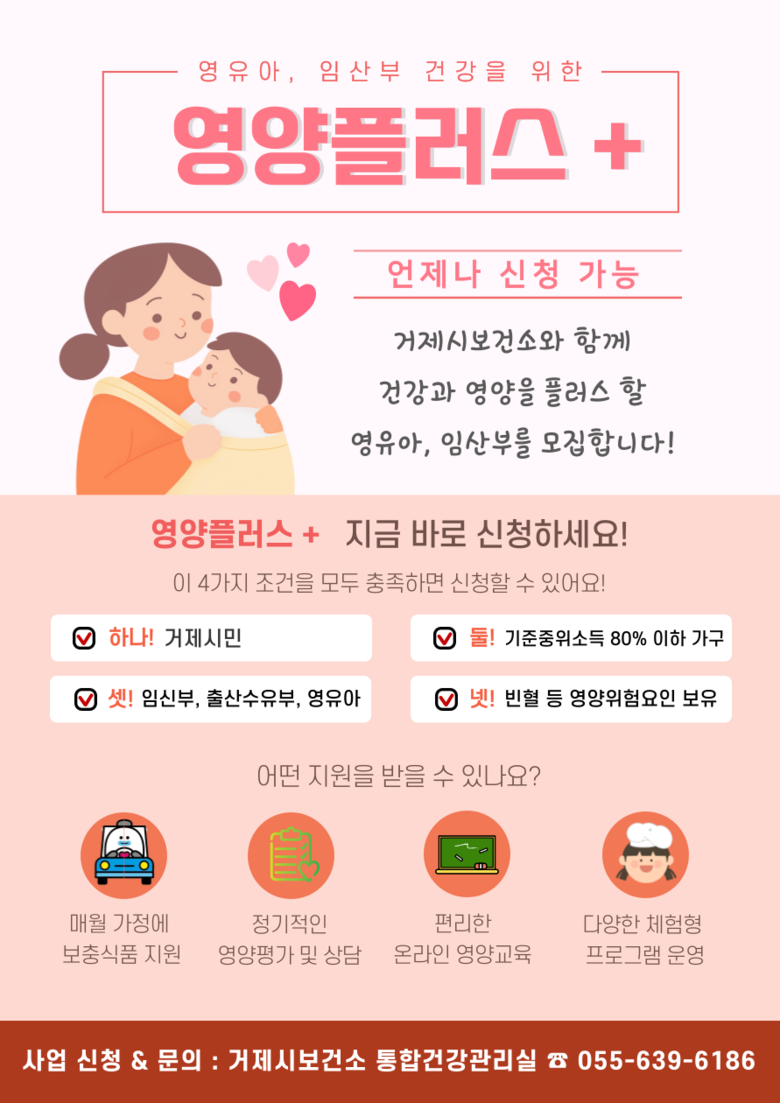 신청 대상은 거제시에 거주하는 임산부 및 영유아(만 66개월 미만)로, 가구 소득이 중위소득 80% 이하이면서 빈혈·저체중·성장부진 등의 영양위험요인을 보유한 경우 신청할 수 있다. 임신부는 소득 기준만 충족하면 별도의 영양위험요인 판정 없이 신청 가능하다.