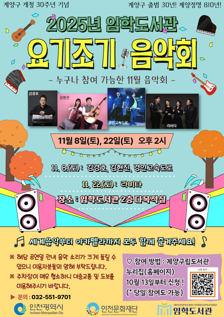 자세한 공연 안내 및 신청은 계양구립도서관 누리집(www.gygle.go.kr)을 참고하거나 임학도서관 종합자료실(☎032-551-9701)로 문의하면 된다.