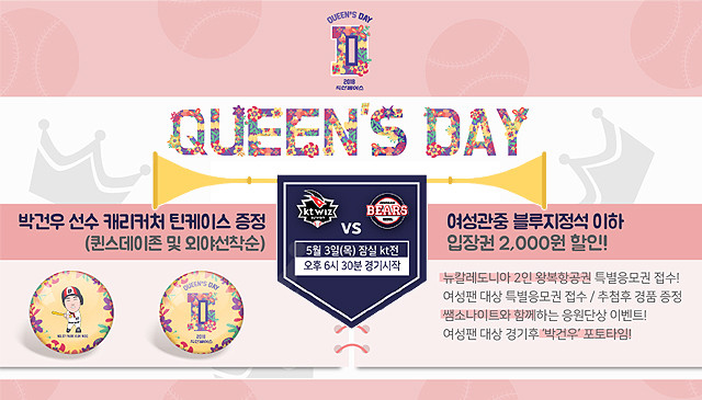 [ 세계타임즈 김인수 기자 ] 두산베어스(社長 全豐)가 5월 3일(목) 잠실에서 열리는 kt와의 홈경기에서 ‘퀸스 데이(Queen’s Day)’ 이벤트를 실시한다.