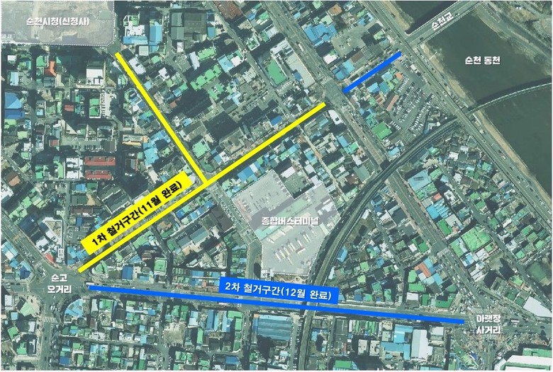 전신주 철거일정은 장천2길(터미널사거리~OK마트), 이수로(순고오거리~순천교) 구간이 11월 말까지 마무리되며, 팔마로(순고오거리~아랫장사거리) 구간은 12월 말까지 철거를 완료할 계획이다.