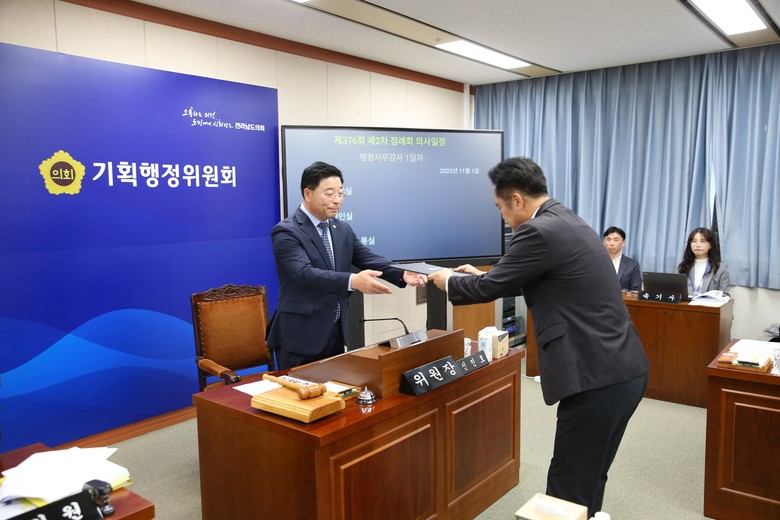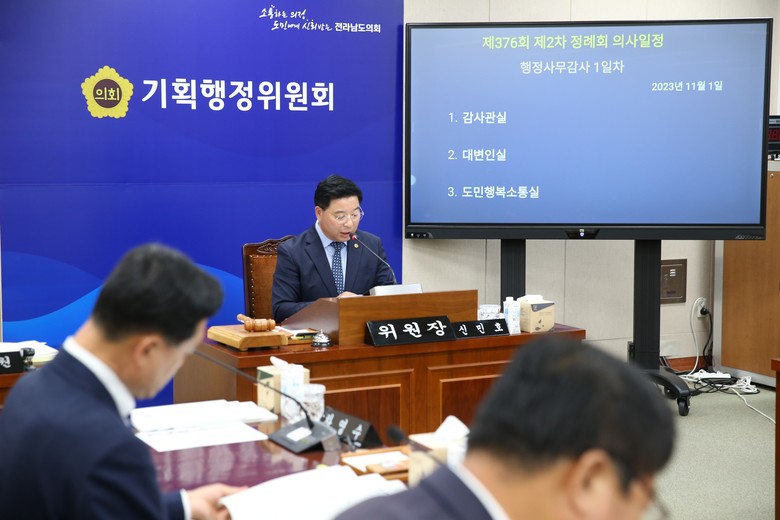 사진설명 : 전라남도의회 신민호 기획행정위원장은 지난 1일 전라남도 감사관실을 대상으로 행정사무감사를 진행했다.