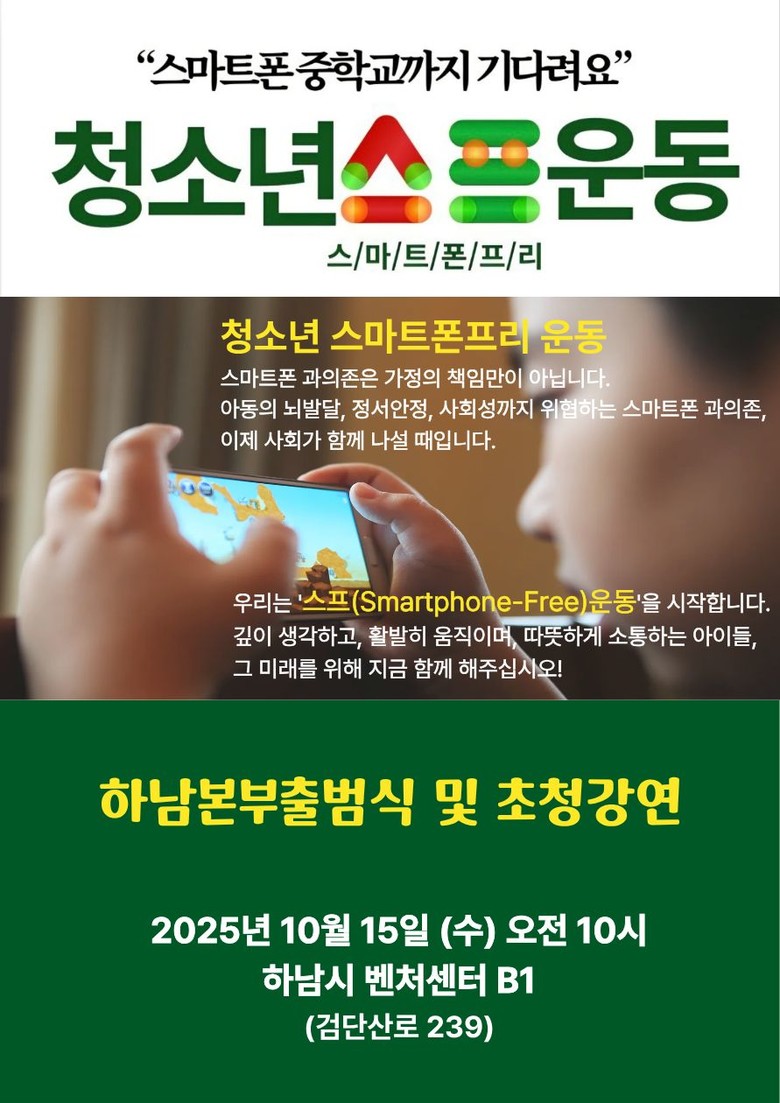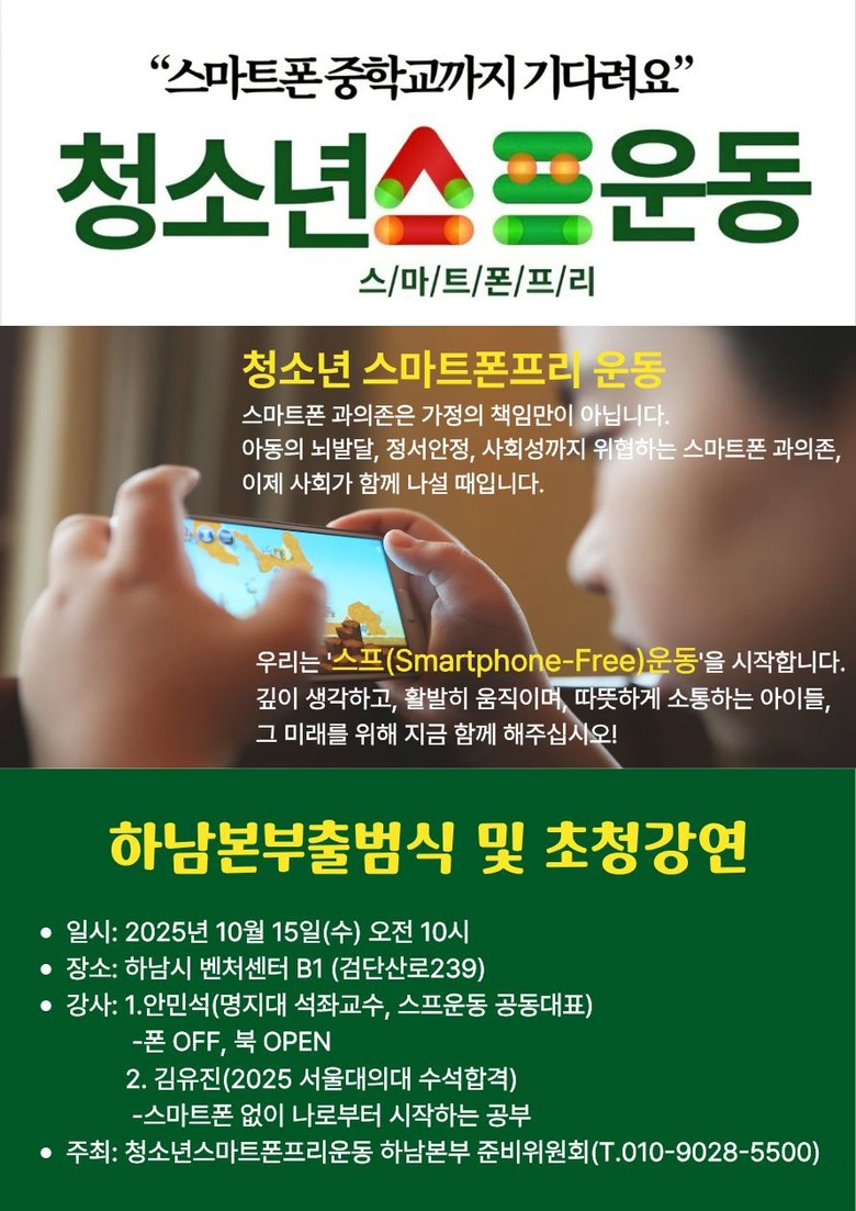 -향후 학부모단체와 연대하여 캠페인 등을 통해 하남시민의 공감 이끌 예정 [하남시 세계타임즈=송민수 기자] 15일 오전 10시, 하남시 벤처센터에서 ‘청소년 스마트폰 프리 운동(Smartphone-Free)’(이후 ‘스프운동’) 하남본부 출범식을 갖는다.