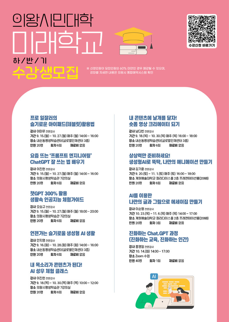 이번 하반기 강좌에는 ▲챗지피티 잘 쓰는 법 배우기 ▲생활 속 인공지능 체험 가이드 ▲인공지능으로 만드는 나만의 에세이집 ▲숏폼 영상 크리에이터 되기 ▲ 아이패드 활용법 ▲생성형 인공지능 생활 등의 인공지능 및 디지털 활용 기술을 실생활과 접목할 수 있는 프로그램이 다채롭게 개설돼 있다.