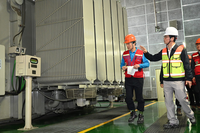 손병석 코레일 사장(왼쪽 두번째)이 11일 오후 경기도 구리시 구리변전소에서 주변압기 등 변전설비를 살펴보고 있다.