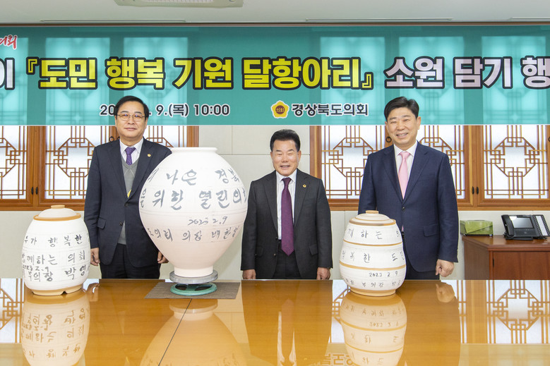 [경북 세계타임즈=한성국 기자] 경상북도의회 배한철 의장, 박영서 부의장, 박용선 부의장은 새봄을 맞아 제337회 임시회 마지막 날인 2월 9일에 달항아리와 차함에 도민 행복을 담은 경상북도의회 소원을 새겼다.