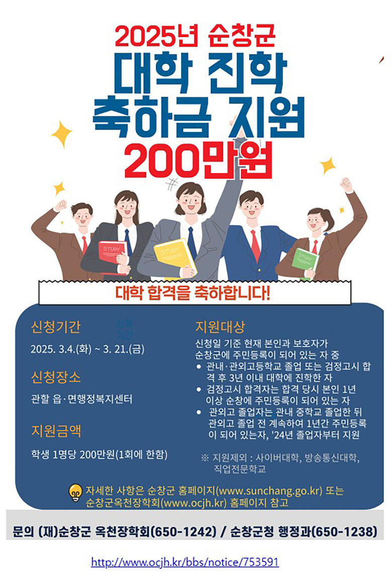 ‘대학 진학 축하금 지원사업’은 순창군이 장학회에 사업비를 출연해 추진하는 사업으로, 학부모의 경제적 부담을 덜고 대학 신입생의 초기 생활 안정을 돕기 위한 취지로 마련됐다.