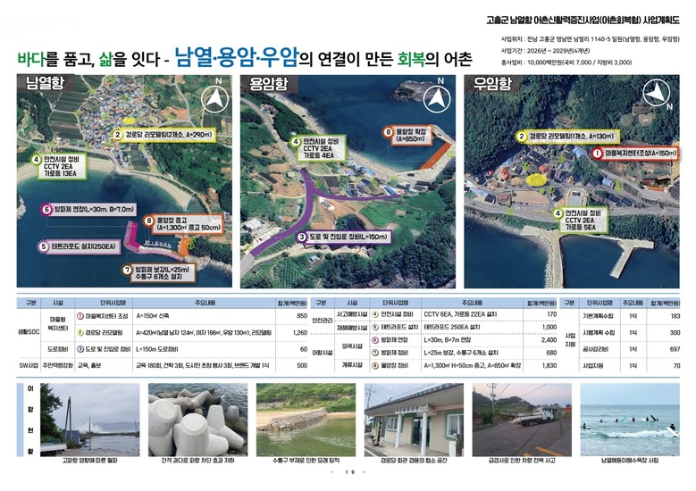 주요 사업으로는 방파제 연장 및 보강, 물양장 확장 및 증고, 도로 및 진입로 정비, 마을복지센터 조성 등이며, 어촌의 생활 인프라 확충과 안전성 강화를 위한 사업이 추진될 예정이다.