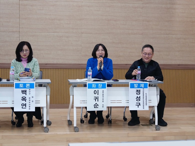 정책토론회는 문화체육관광위원회 민형배 국회의원의 개회사와 이귀순 시의원이 좌장을 맡고, 정성구 위원장(지원포럼 도시환경분과)이 발제를 맡았다. 토론에는 백옥연 팀장(광산구청 문화유산활용팀), 오은영 대표(포럼 문화와 도시), 윤현석 대표(컬쳐네트워크), 이민철 센터장(광산구 도시재생공동체) 등이 토론자로 참여했다.