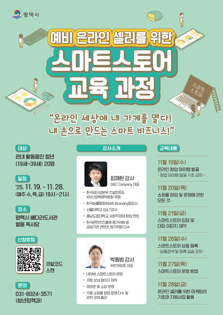 참가 대상은 평택시 관내에서 활발하게 활동 중인 만 19세부터 39세까지의 청년 사업가이며, 신청 기간은 10월 31일부터 11월 19일까지 안내 이미지의 정보무늬(QR코드)를 통해 접수할 수 있다. 이번 교육에 대한 자세한 문의는 평택시청 청년정책과(031-8024-3571)로 하면 된다.