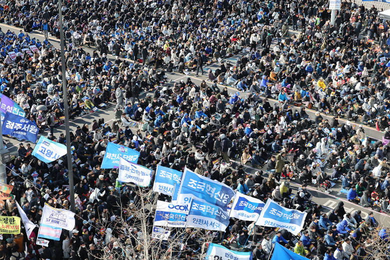 [세계타임즈 = 심귀영 기자] 29일 서울 종로구 동십자각 인근에서 더불어민주당 박찬대 원내대표, 조국혁신당 김선민 대표 권한대행 참석하에 열린 야5당 대통령 탄핵 촉구 사전집회에서 참가자들이 구호를 외치고 있다. 2025.3.29