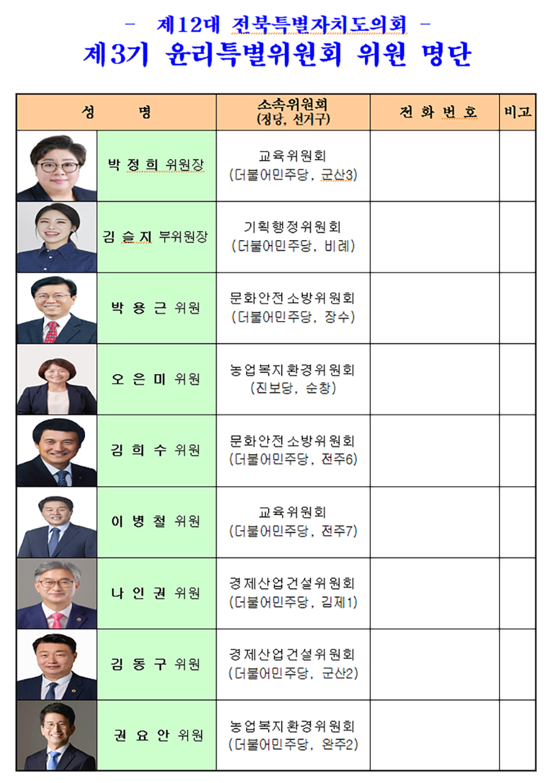 [전북특별자치도의회=세계타임즈 이상호 기자] 전북특별자치도의회 윤리특별위원회는 6. 28(금) 제1차 회의를 개최하고 제12대 제3기 윤리특별위원회를 구성했다.
