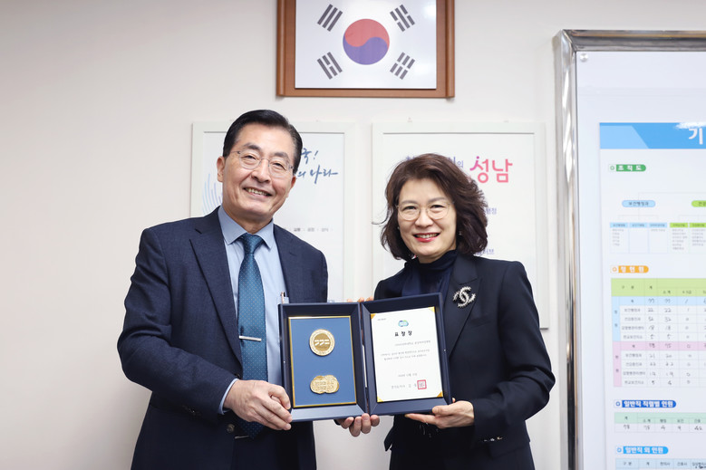 | ▲김영탁 분당차여성병원장(왼쪽)이 구성수 분당 보건소장과 함께 경기도지사 표창 기념촬영을 하고 있다.(사진=분당 차병원) |