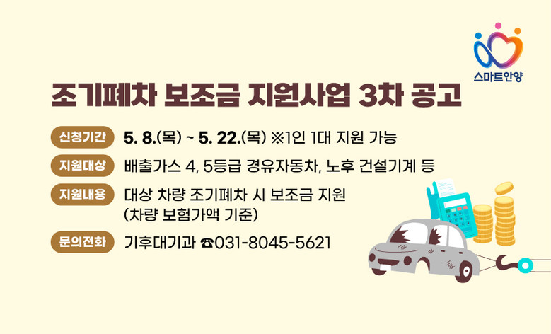 자세한 사항은 안양시 홈페이지(anyang.go.kr) 고시·공고란을 참고하거나 한국자동차환경협회(☎1577-7121) 또는 안양시 기후대기과 대기환경팀(☎02-8045-5621)으로 문의하면 안내받을 수 있다.