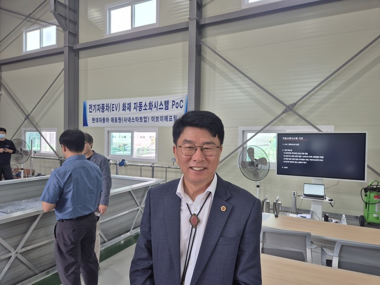[경기도 세계타임즈=송민수 기자] 경기도의회 안전행정위원회 윤성근 부위원장(국민의힘, 평택4)은 10월 2일 화성시 팔탄면 현대자동차 실증실험실에서 열린 ‘전기자동차 자동소화시스템’ 시연회에 참석해 시스템 작동 과정과 화재 진압 성능을 점검했다.