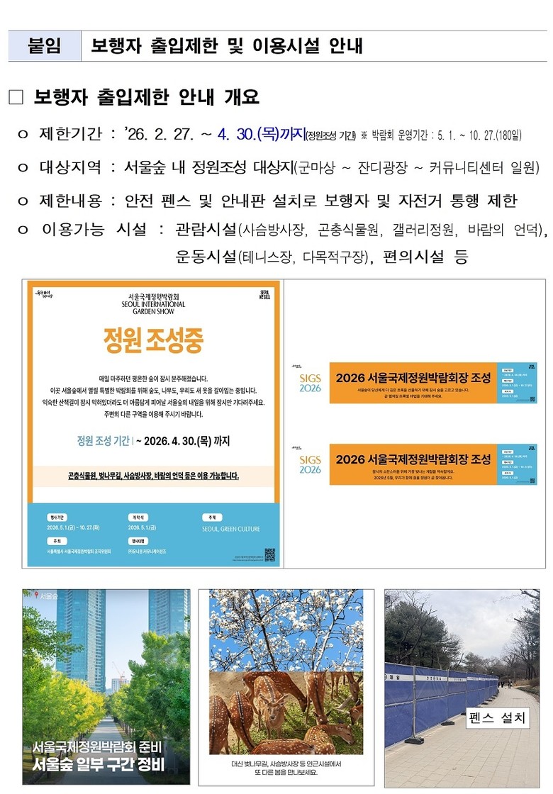서울시는 2월 27일부터 4월 30일까지 보다 안전하게 박람회를 준비하기 위해, 서울숲 중앙잔디광장을 포함한 공원 일부 구간의 시민 출입을 제한할 예정이다.