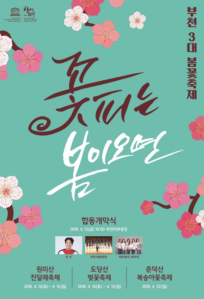 올해는 3대 봄꽃축제를 알리는 합동개막식을 부천마루광장에서 개최해 보다 성대한 축제의 장을 마련한다. 또 봄꽃축제 둘레길 투어와 시티투어 특별코스로 축제의 재미를 더한다.