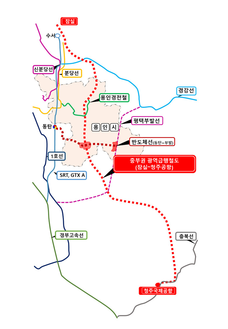 ‘중부권 광역급행철도(JTX)’ 노선은 ‘경강선 연장’ 구간을 포함하고 있어 대한민국 반도체산업 핵심거점이 될 처인구 이동·남사읍에 있는 ‘용인 첨단시스템반도체 클러스터 국가산업단지’를 통과한다. 시는 ‘용인 첨단시스템반도체 클러스터 국가산업단지’를 중심으로 ‘경강선 연장’ 노선과 ‘동탄~부발선’ 노선을 연결할 수 있을 것으로 보고 있다.