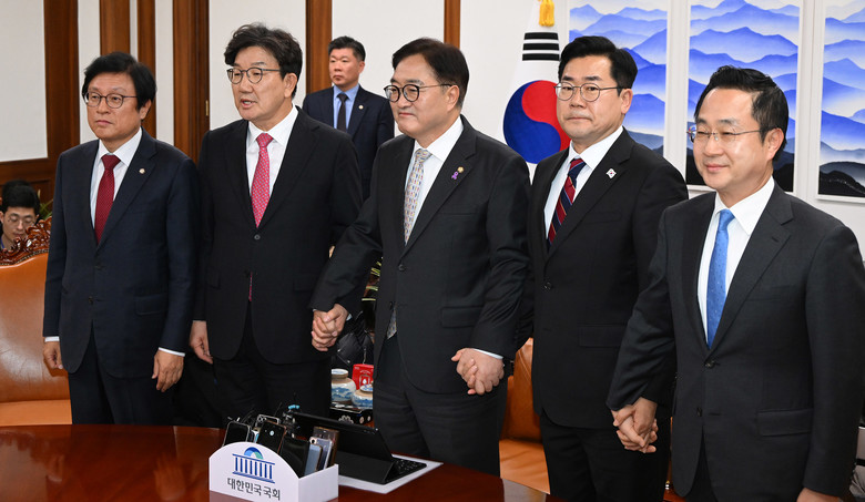 우원식 국회의장이 지난 17일 오후 서울 여의도 국회에서 국민의힘 권성동 대표 권한대행 겸 원내대표, 더불어민주당 박찬대 원내대표와 대화하기에 앞서 기념촬영 하고 있다.