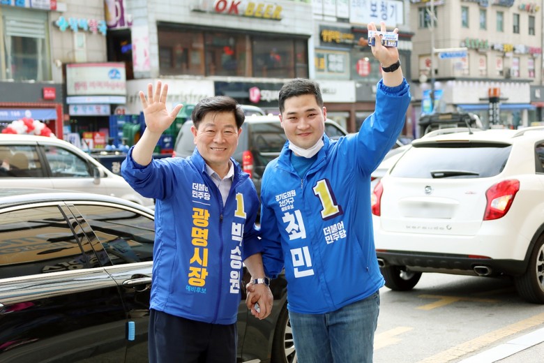 최민 경기도의원 후보(오른쪽)가 박승원 광명시장 후보와 함께 선거운동을 하고 있다. (사진=청춘캠프 제공)