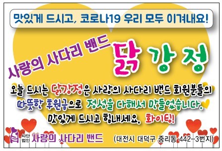 대전광역시시각장애인연합회 이상용 관장은 “오늘 사랑의 사다리 밴드 봉사단체에서 닭강정을 지원해 주어서 큰 힘과 위안이 된다.”면서 감사함을 전했다.