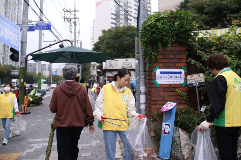 | ▲지난 16일 신천지자원봉사단 동작지부의 거리 청소 봉사가 신대방 1동에서 진행된 가운데 봉사자가 서울시 교육감 보궐선거 신대방 제1동 제5투표소 앞을 청소하고 있다. [사진 제공 = 신천지자원봉사단 동작지부] |