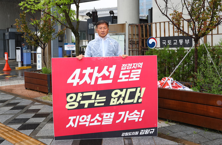 [강원도 세계타임즈=김민석 기자] 강원특별자치도의회 김왕규 의원은 22일 세종시 정부청사 앞에서 접경지역의 열악한 도로 사정과 사회기반시설(SOC) 확충의 필요성을 알리기 위한 1인 시위를 진행했다. 이번 시위는 지역을 경유하는 고속도로와 인근 지역과 연결되는 4차선 도로가 없는 양구군의 지역소멸 위기에 대한 깊은 우려와 함께, 국가 차원의 실질적 지원을 촉구하기 위해 마련되었다.
