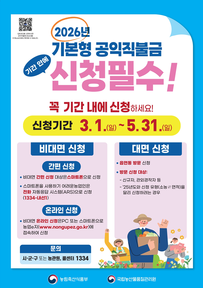 올해는 비대면 신청과 대면 신청 기간을 3개월로 통합해 운영한다. 비대면 신청은 농업인의 편의를 높이기 위해 신청 기간을 기존 1개월에서 3개월로 확대했으며, 신청일 기준 농업경영체 등록정보가 전년도와 동일한 경우 별도의 서류 제출 없이 온라인(인터넷·스마트폰)이나 자동응답전화(ARS)를 통해 간편하게 신청할 수 있다.