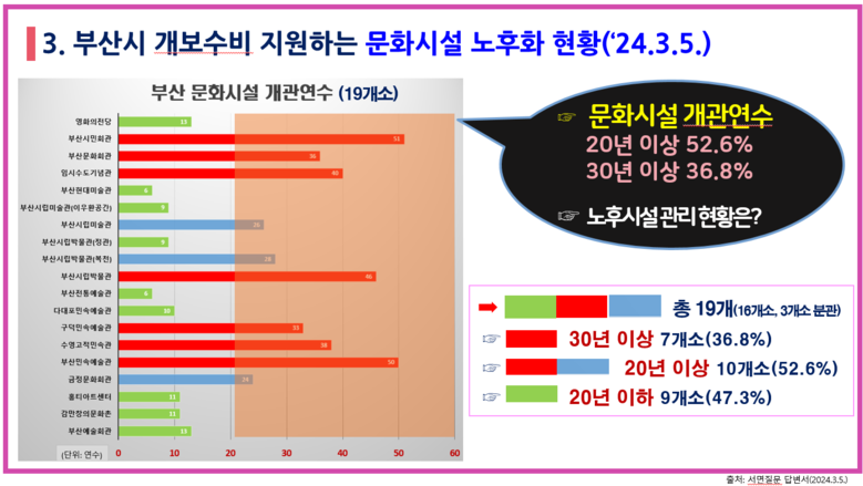 ◈ 부산시가 개보수비 지원하는 문화시설, 20년 이상 된 시설 52.6%, 30년 이상 된 시설도 36.8%에 달해