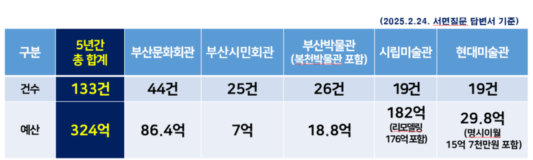 실제로 부산시는 최근 5년간(2020~2024) 287억 원 이상을 문화시설 개보수에 투입했으며(24년 3월 기준), 주요 5대 문화시설(부산문화회관, 부산시민회관, 부산박물관, 부산시립미술관, 부산현대미술관) 개보수비 예산(25년 2월 기준)은 324억 원으로,