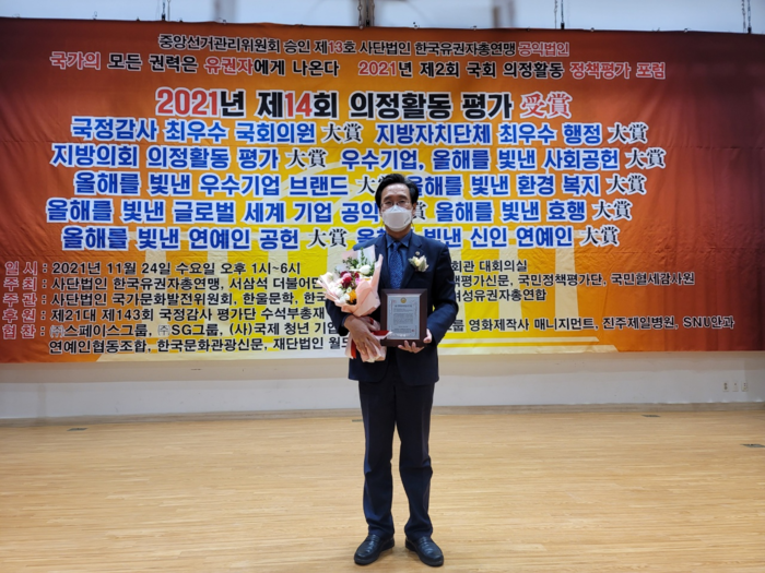 [광주=세계타임즈 손권일 기자] 장재성 의원(더불어민주당, 서구1)은 지난 24일, 국회의원회관 대강당에서 열린 (사)한국유권자총연맹, 국민혈세감사원 등이 공동주최한 『2021 지방의회 의정활동 평가 대상』 시상식에서 ‘최우수 대상’을 수상했다.
